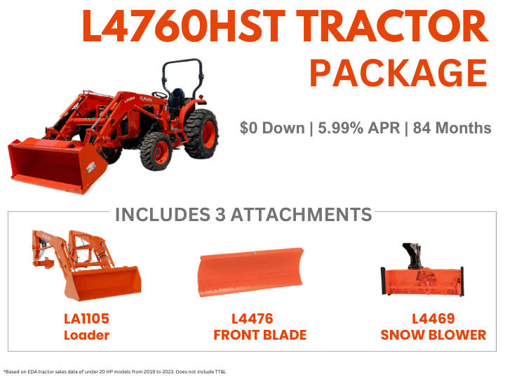 Attachments: LA1105 (loader), L4476 (front blade), L4469 (snow blower)
